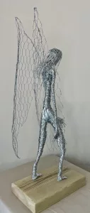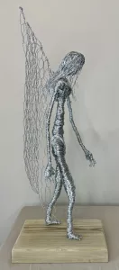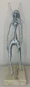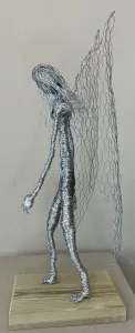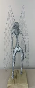 Flowing strands of wire form the angel’s hair, adding a touch of grace and movement. The most striking feature, however, is the pair of large, open-weave wings made from chicken wire, extending gracefully from the figure’s back. These wings are both substantial and airy, conveying a sense of potential flight and divine presence. The angel’s posture, with a slightly bowed head, exudes an aura of serenity and introspection. Mounted on a simple yet sturdy wooden base, “Angel” is a deeply moving and visually captivating piece that would bring a sense of peace and inspiration to any setting.