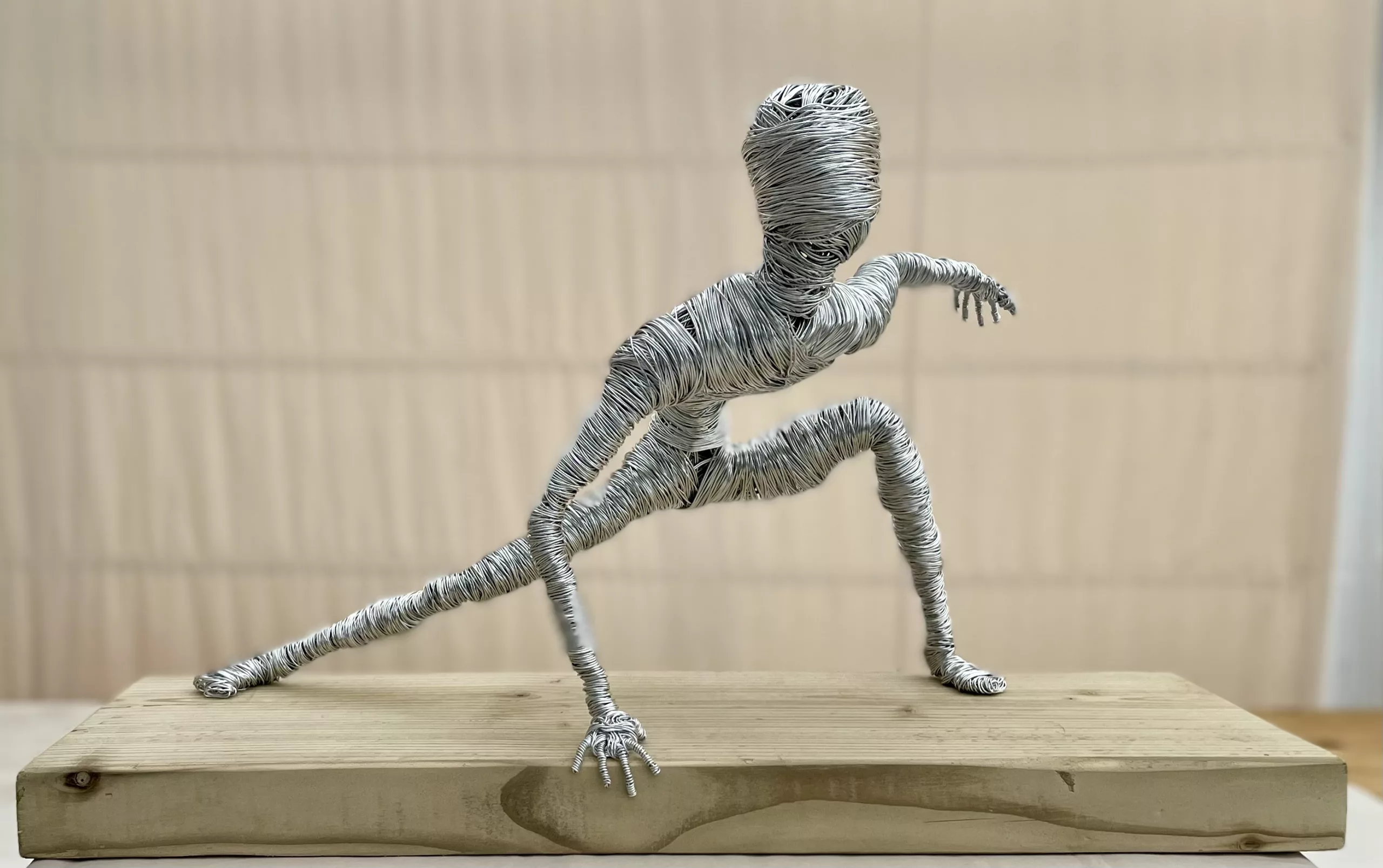 The texture of the tightly wound wire adds a unique tactile quality, inviting closer inspection. The absence of a traditional face allows the viewer to project their own imagination onto the hero, focusing instead on the powerful body language. Mounted on a substantial, light-toned wooden base, “Hero’s Landing” is a compelling and unique artistic statement that speaks of resilience, strength, and unwavering purpose. It’s a striking piece for any space that celebrates quiet power and heroic spirit.