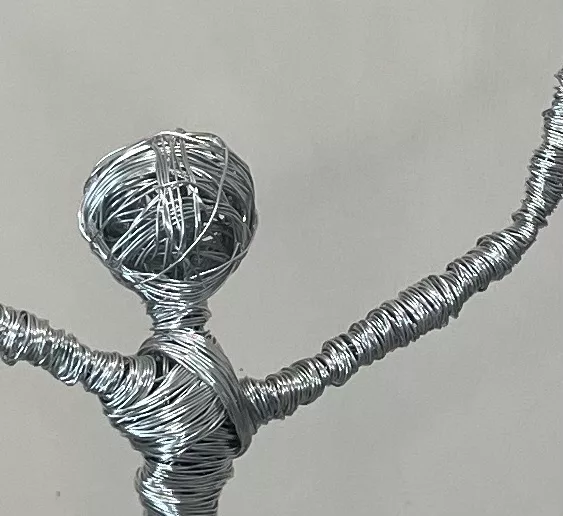 Crafted from shimmering silver-toned wire, the figure of a dancer or aerialist is suspended in a graceful pose, one leg bent and the other extending elegantly, creating a sense of lightness and ascent. The artist has meticulously coiled the wire to form the body, creating a textured surface that catches the light and emphasizes the fluid lines of the human form.