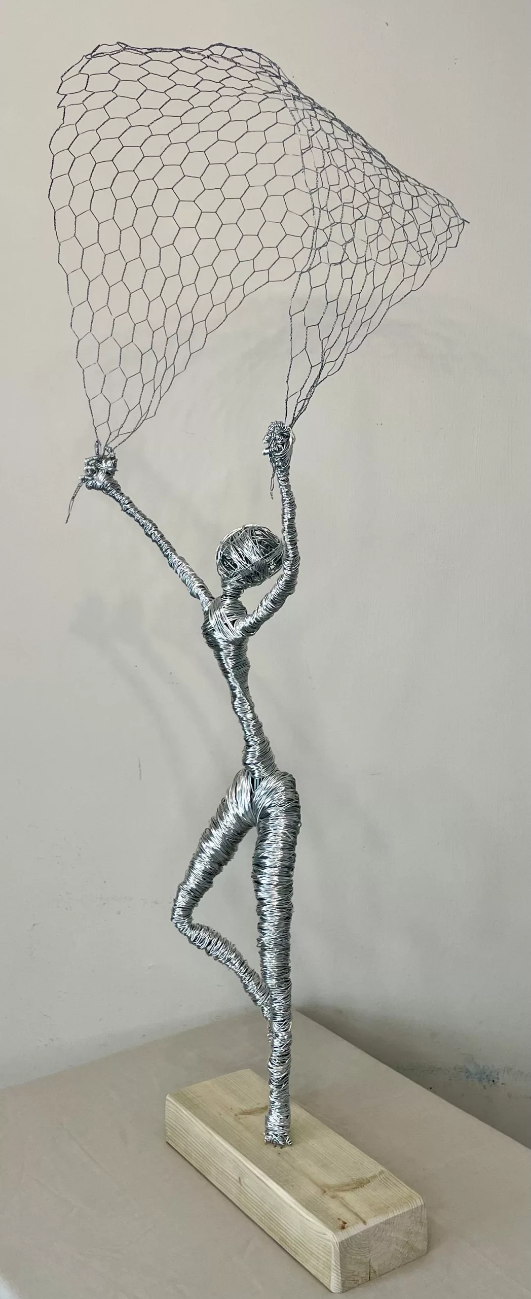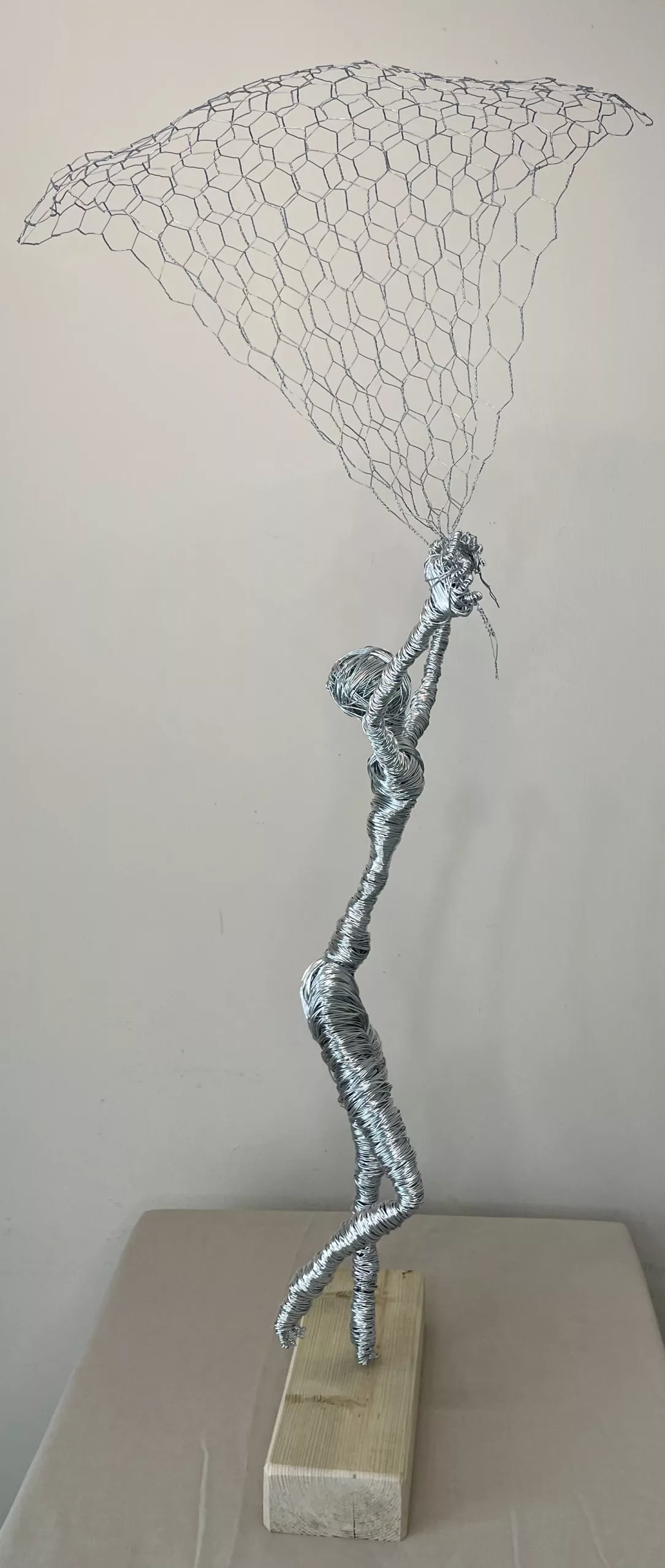 Above the figure, a large, expansive form made of open-weave chicken wire suggests a parachute or, as the title implies, a kite, creating a powerful visual connection between the figure and the concept of flight. The uplifted arms reach towards this aerial element, enhancing the feeling of being carried aloft. Mounted on a simple yet sturdy wooden base, “Kite Flight” is a captivating and inspirational piece, perfect for anyone who appreciates the beauty of movement, dreams of liberation, or seeks an artwork that evokes a sense of weightlessness and joy.