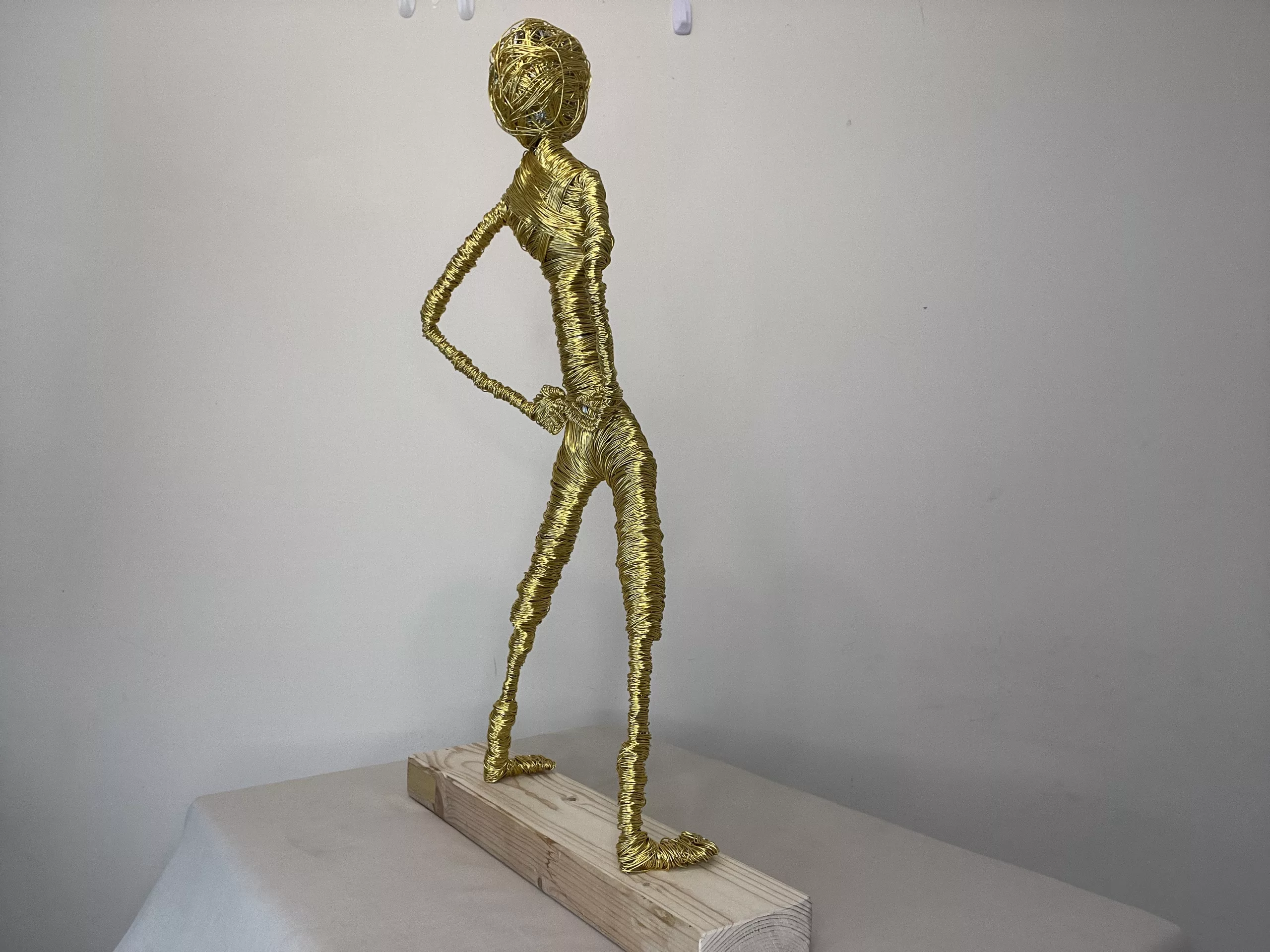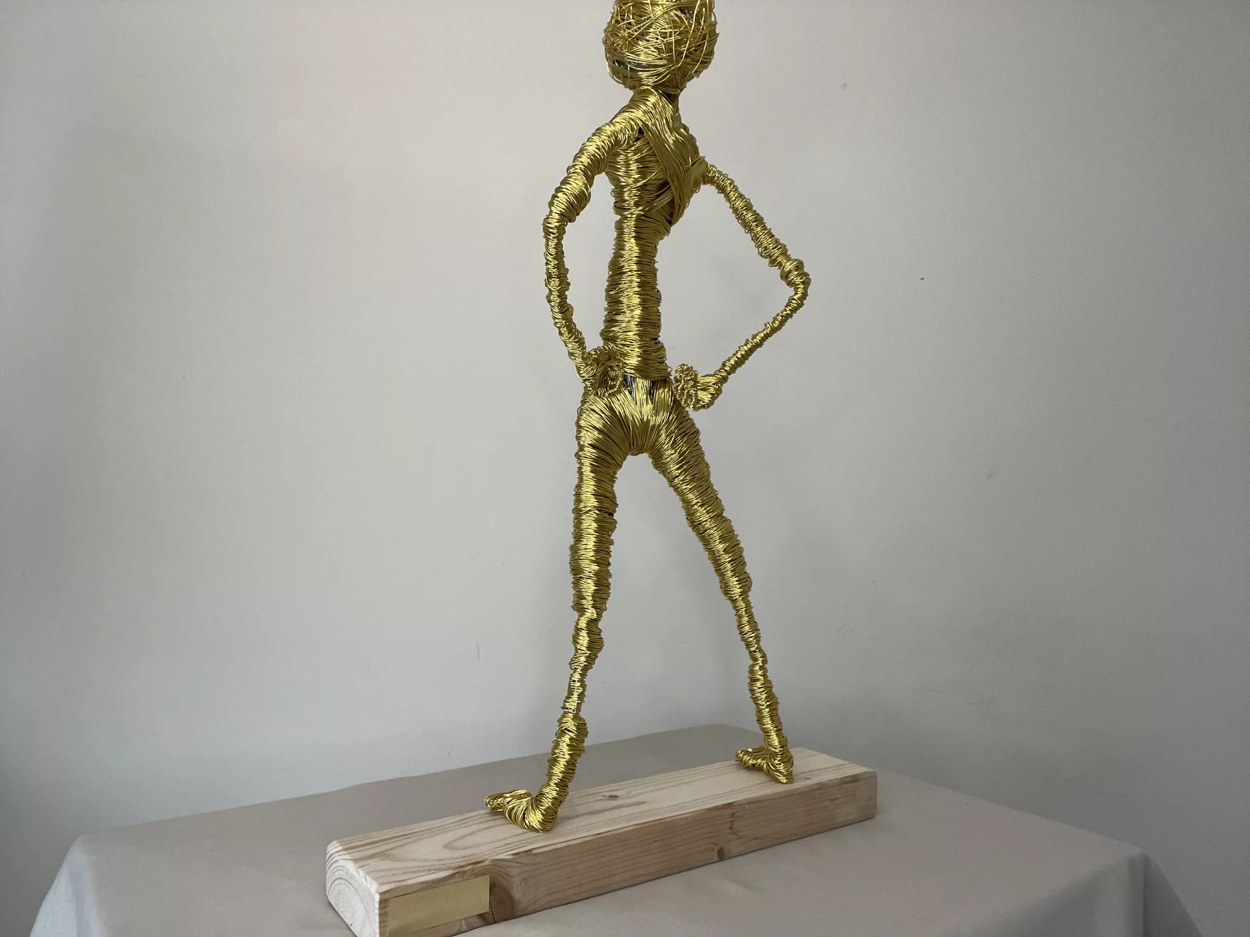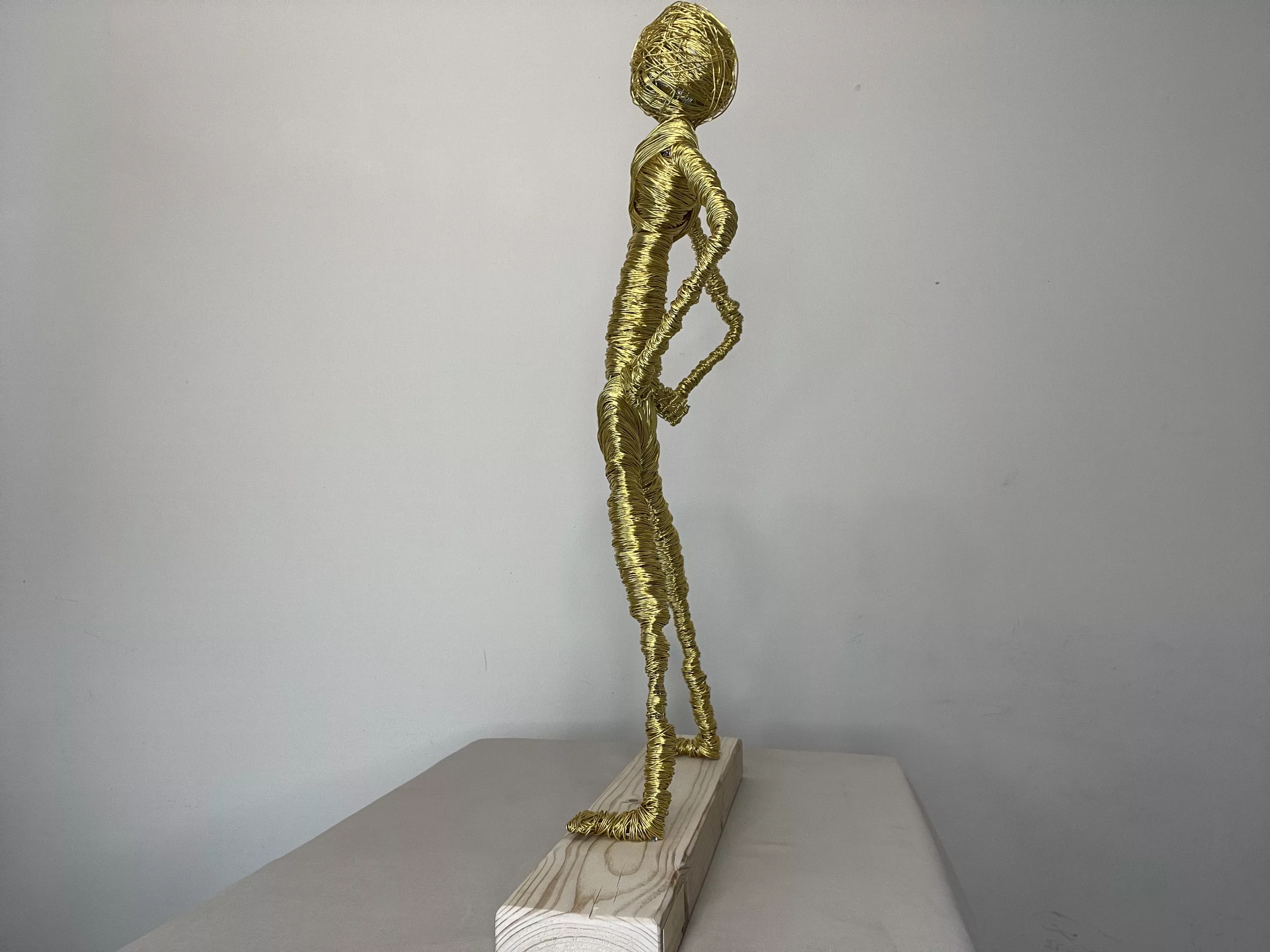 This striking sculpture depicts a stylised human figure crafted from a continuous winding of golden wire.